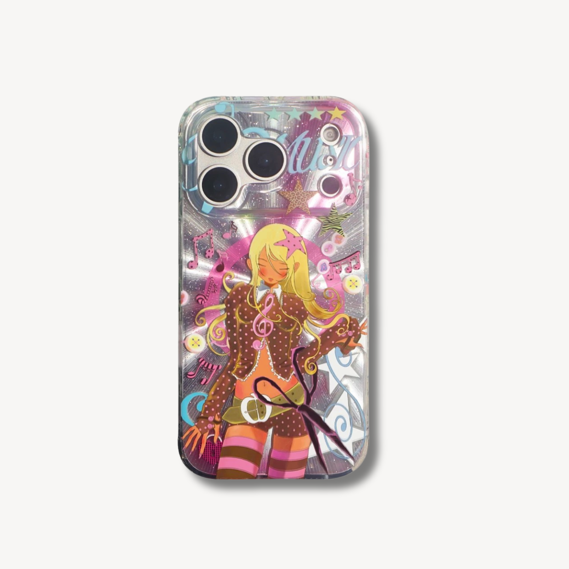 Live out your 2000s pop idol fantasy with the Pop Star Phone Case. Inspired by the golden era of music videos and glittery stage outfits, this design features our signature "Pop Star" character surrounded by musical notes, hibiscus flowers, and bold leopard print stars.
